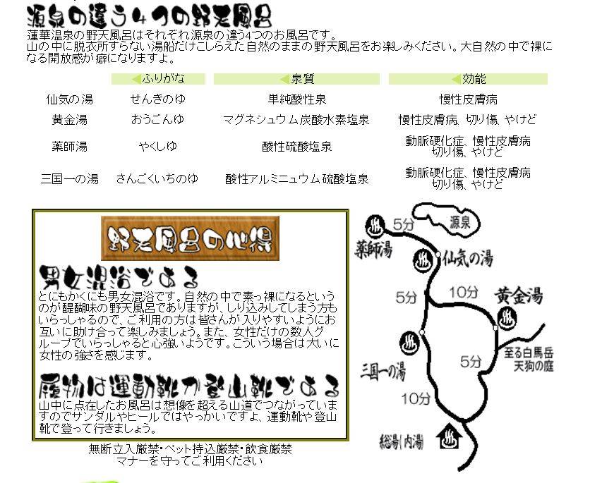 ・・・蓮華温泉の蓮華とは・・・ 夕食前に、露天風呂を総て攻略予定でしたが、雨となり、黄金の湯に挑戦して撤退、 黄金の湯の底は、天然のぬめりコケ?が密生し、滑るの立てません。 総てが自然のままです。