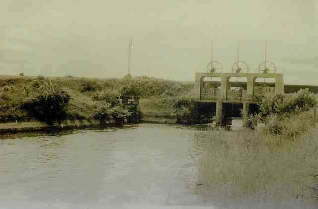 渡刈町上糟目・矢作制水門、後方の鉄橋は名鉄大樹寺線