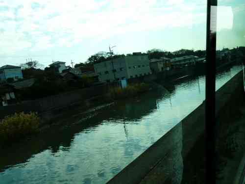 I中井筋終点附近(高浜市大山公園西)中井筋終点附近をバスで車窓見学です。 この流れは、中井筋用悪水と思われます。終点は、衣浦大橋附近の青木町、境川河口に注ぐ、